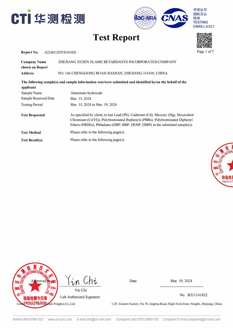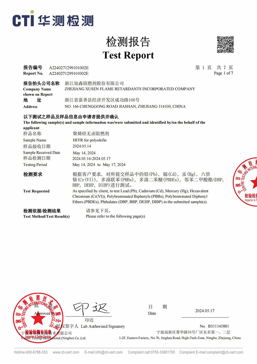 폴리올레핀 ROHS 테스트 보고서의 화염 지연